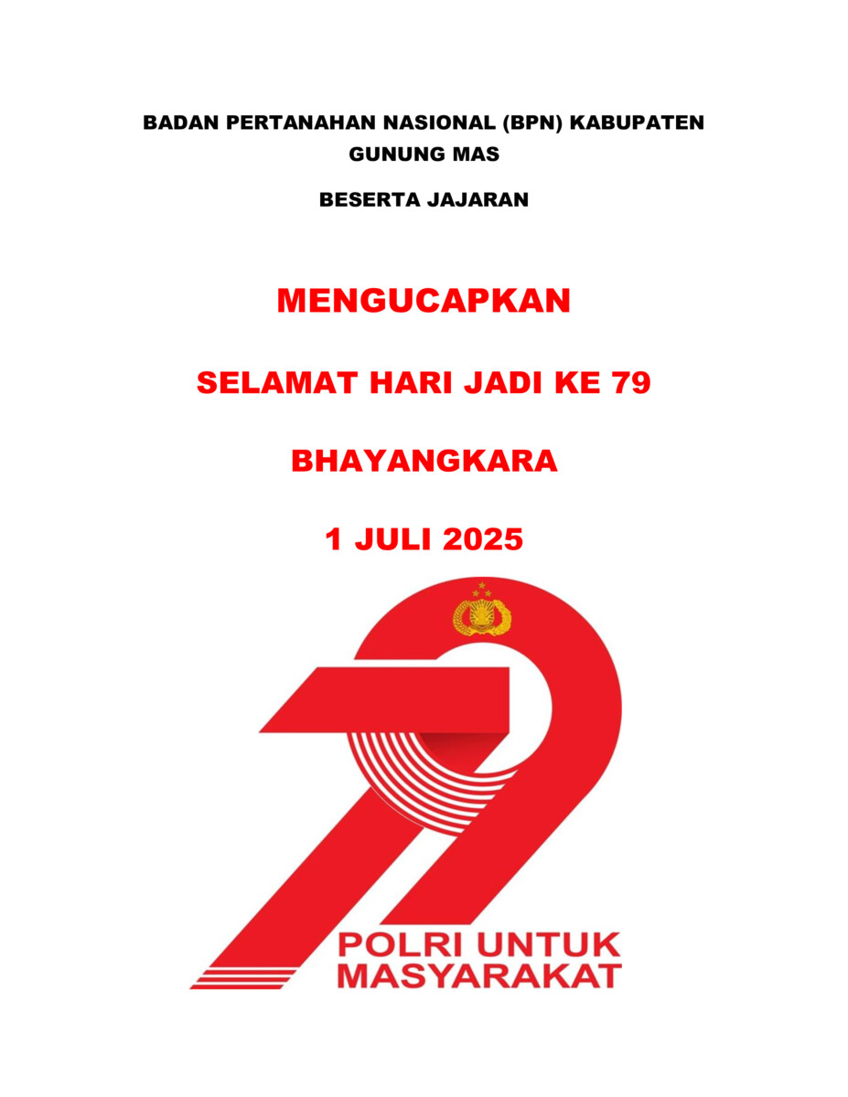 Badan Pertanahan Nasional (BPN) Kabupaten Gunung Mas,Beserta Jajaran, mengucapkan Selamat Hari Jadi Bhayangkara ke 79 tahun 2025, yang jatuh pada tanggal 1 Juli 2025, pada Selasa depan.