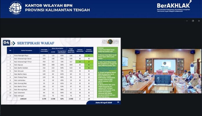 Palangka Raya, Nusaborno.com – Kantor Wilayah Badan Pertanahan Nasional (BPN) Provinsi Kalimantan Tengah menggelar kegiatan monitoring dan evaluasi (monev) kinerja terhadap seluruh Kantor Pertanahan kabupaten/kota se-Kalimantan Tengah secara daring, Rabu (8/4/2026).