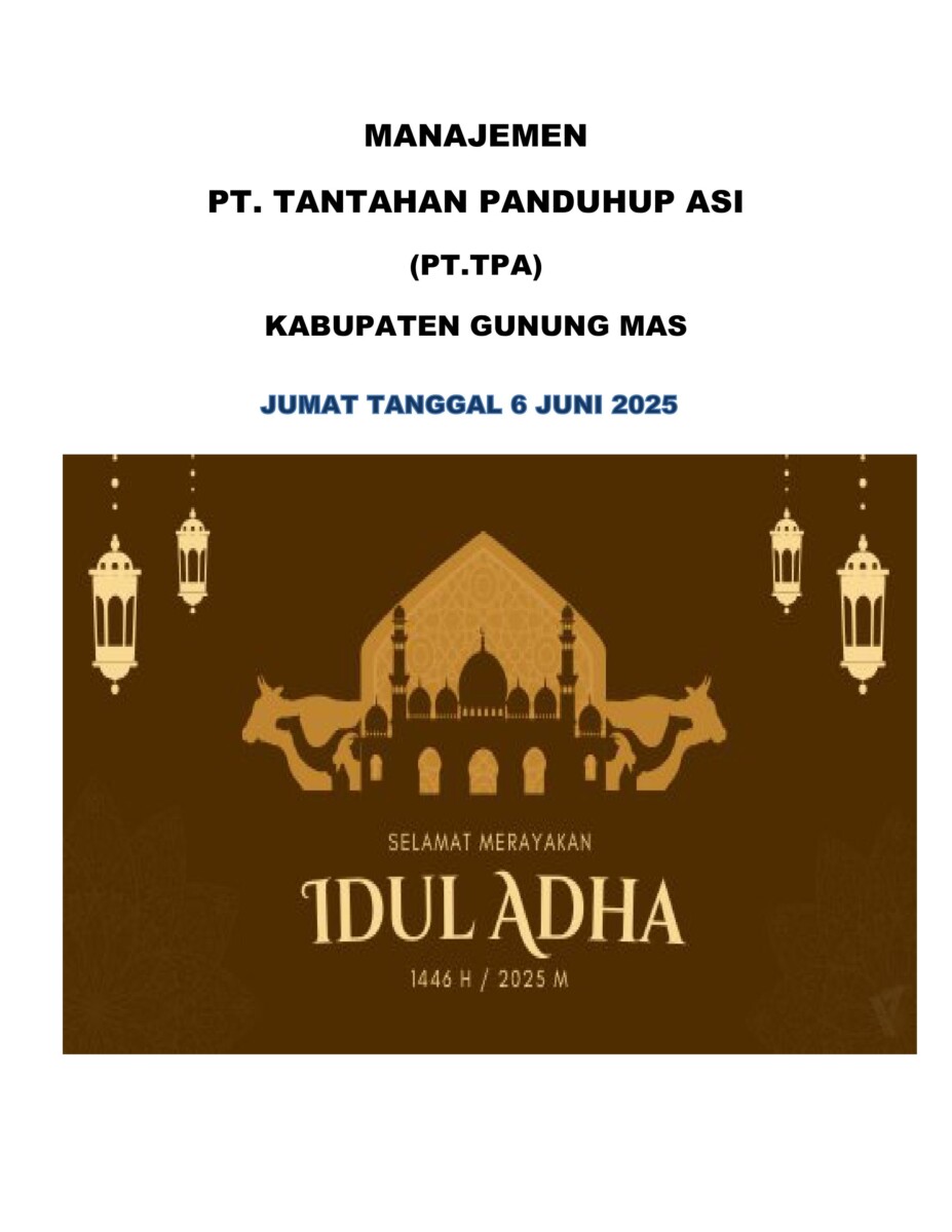 Oleh sebab itu, Kehumasan dan Media Manajemen PT Tantahan Panduhup Asi,( PT.TPA), mengatakan Menjelang hari Idul Adha tahun ini membawa kita lebih dekat dengan Allah dan menjadikan kita pribadi yang lebih baik. Selamat Idul Adha, bagi Umat Muslim yang merayakan, semoga hati kita selalu bersih dan penuh kasih.