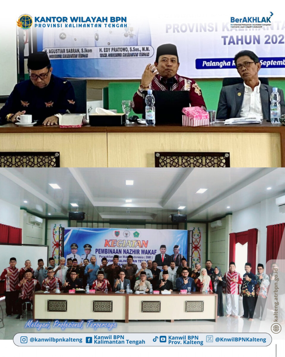 Palangka Raya, Nusaborneo.com – Kantor Wilayah (Kanwil) Badan Pertanahan Nasional (BPN) Provinsi Kalimantan Tengah (Kalteng) melalui Bidang Penetapan Hak dan Pendaftaran turut menghadiri kegiatan Pembinaan Nazhir Wakaf yang diselenggarakan oleh Perwakilan Badan Wakaf Indonesia (BWI) Provinsi Kalteng. Kegiatan berlangsung di Aula Lembaga Pengembangan Tilawatil Qur’an (LPTQ) Provinsi Kalimantan Tengah.