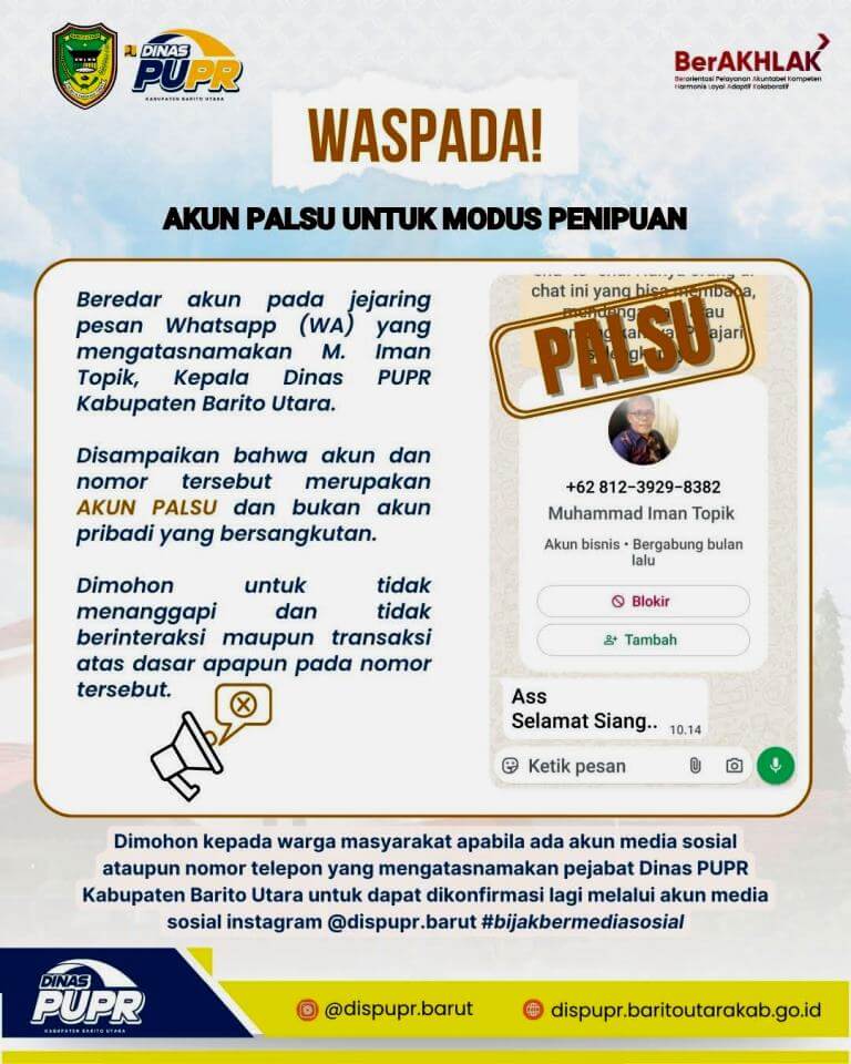 Sebagai langkah klarifikasi, masyarakat dapat mengakses informasi resmi melalui akun Instagram Dinas PUPR Barito Utara di @dispuppr.barut atau kanal resmi lain yang telah terverifikasi.