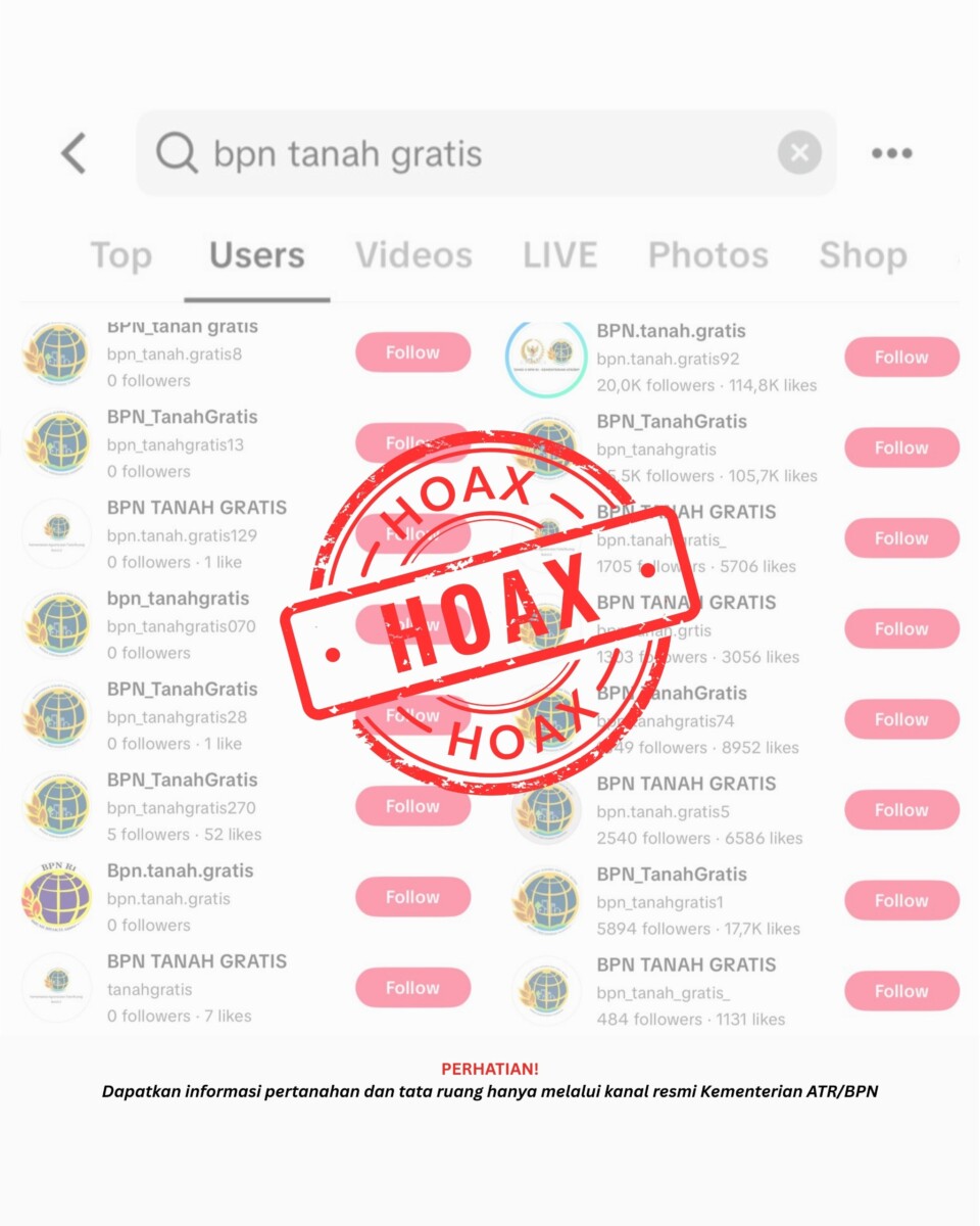 “Kami melihat banyak sekali akun TikTok @bpn_tanahgratis beredar. Untuk itu, masyarakat diimbau untuk tidak terpengaruh dengan akun media sosial tidak resmi yang menyebarkan klaim seperti ‘BPN Tanah Gratis’. Informasi dan layanan resmi hanya dapat diperoleh melalui kanal resmi Kementerian, yakni situs atrbpn.go.id dan akun media sosial resmi kami,” tegasnya saat ditemui di Kantor Kementerian ATR/BPN, Jakarta, Selasa (19/08/2025).