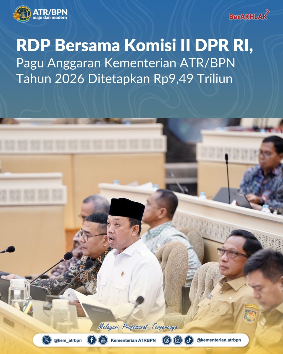“Untuk pagu Kementerian ATR/BPN di tahun anggaran 2026 sebesar Rp9,499 triliun terdiri dari program dukungan manajemen, program pengelolaan dan pelayanan pertanahan, dan program penyelenggaraan penataan ruang,” terang Menteri Nusron yang hadir dalam RDP didampingi oleh Wakil Menteri (Wamen) ATR/Wakil Kepala (Waka) BPN, Ossy Dermawan.