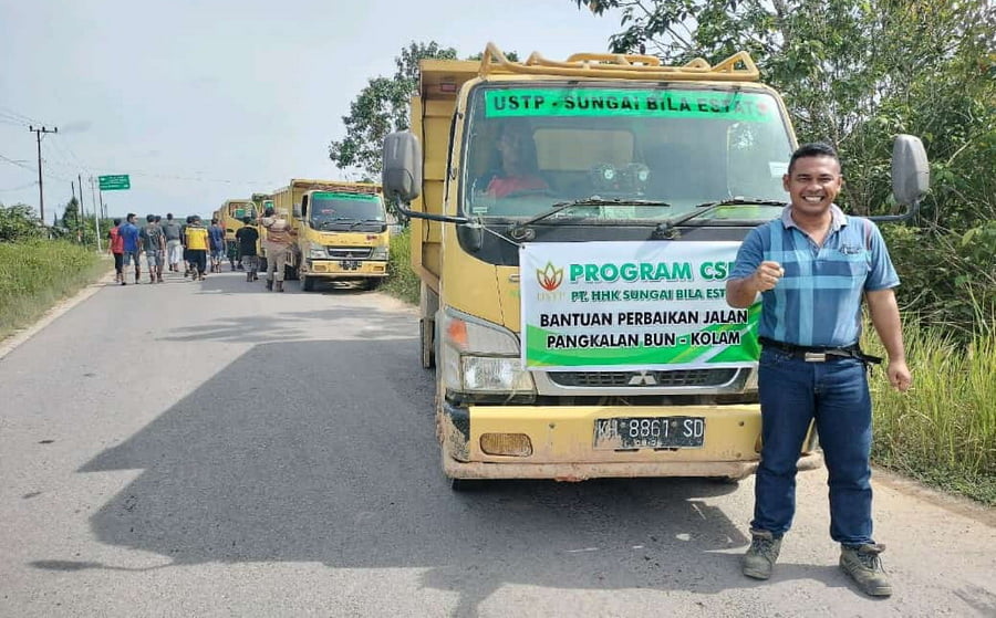 Pangkalan Bun, Nusaborneo.comUnion Sampoerna Triputra Persada (USTP) Group melalui anak perusahannya PT Harapan Hibrida Kalbar-Sungai Bila Estate (HHK-SBE) memberikan bantuan tanah latrite sebanyak 25 rit dump truck (DT) untuk perbaikan ruas Jalan Pangkalan Bun-Kotawaringin Lama (Kolam). Bantuan tersebut dikirimkan Jumat (13/1/2023) tadi langsung ke lokasi perbaikan jalan.