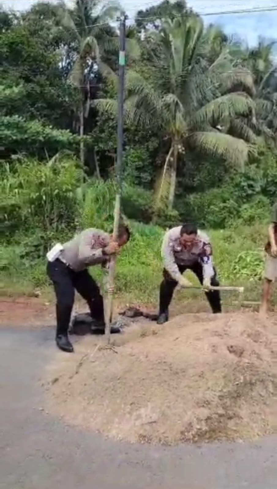 “Pada waktu patroli, kami menemukan jalan berlobang yang cukup lebar dan dalam. Lalu kami mencari tanah uruk satu truk untuk menutup lobang tersebut agar pengguna jalan tidak terperosok, sambil menunggu dilakukan perbaikan oleh instansi terkait,” terang Anang.