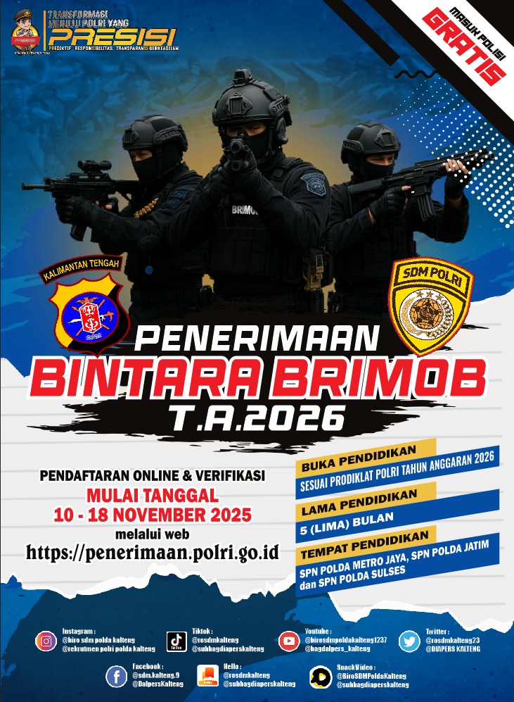 Palangka Raya, Nusaborneo.com – Kepolisian Daerah Kalimantan Tengah (Polda Kalteng) kembali membuka kesempatan bagi putra-putri terbaik daerah untuk bergabung sebagai calon Bintara Brimob Polri Tahun Anggaran 2026. Pendaftaran resmi dibuka mulai 10 hingga 18 November 2025.