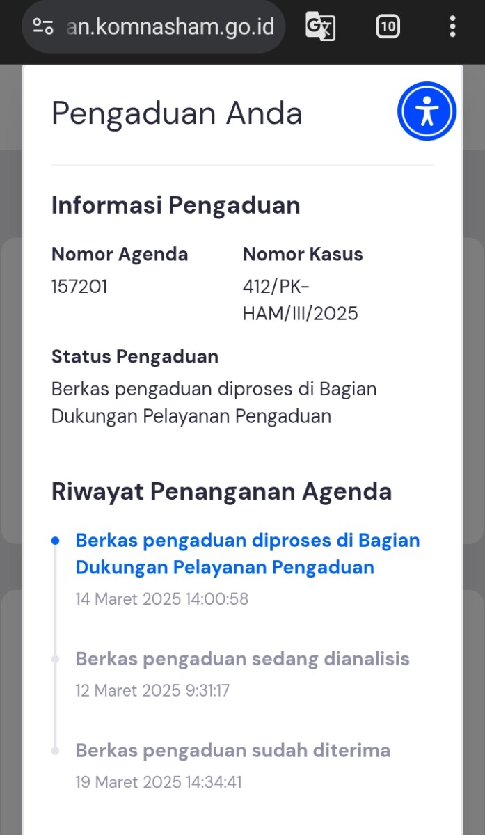 Pelaporan yang masuk Komnas HAM,nomor 157201, per-tanggal 19 Maret 2025. Saat ini dalam evaluasi pihak Komnas HAM RI. Yang mana pelapor mengungkapkan terus tanpa henti kordinasi dengan tim Komnas HAM,untuk meminta data dan serta kelengkapan validasi pelaporan ini.