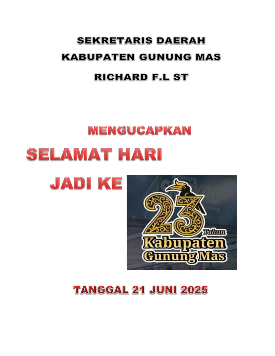 Sekda Kab Gumas,Richard,ST beserta jajaran mengucapkan Selamat HUT Kabupaten Berjuluk Habangkalan Karuhei Tatau ke 23 Tahun.