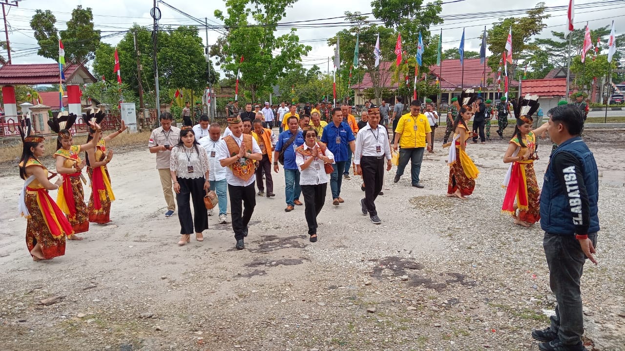 Mereka disambut hangat dengan pemasangan Selendang Dayak dan langsung masuk ke dalam ruangan pendaftaran, serta dilanjutkan penyerahan berkas administrasi pendaftaran bakal pasangan calon bupati dan wakil bupati gumas kepada Ketua KPU setempat.