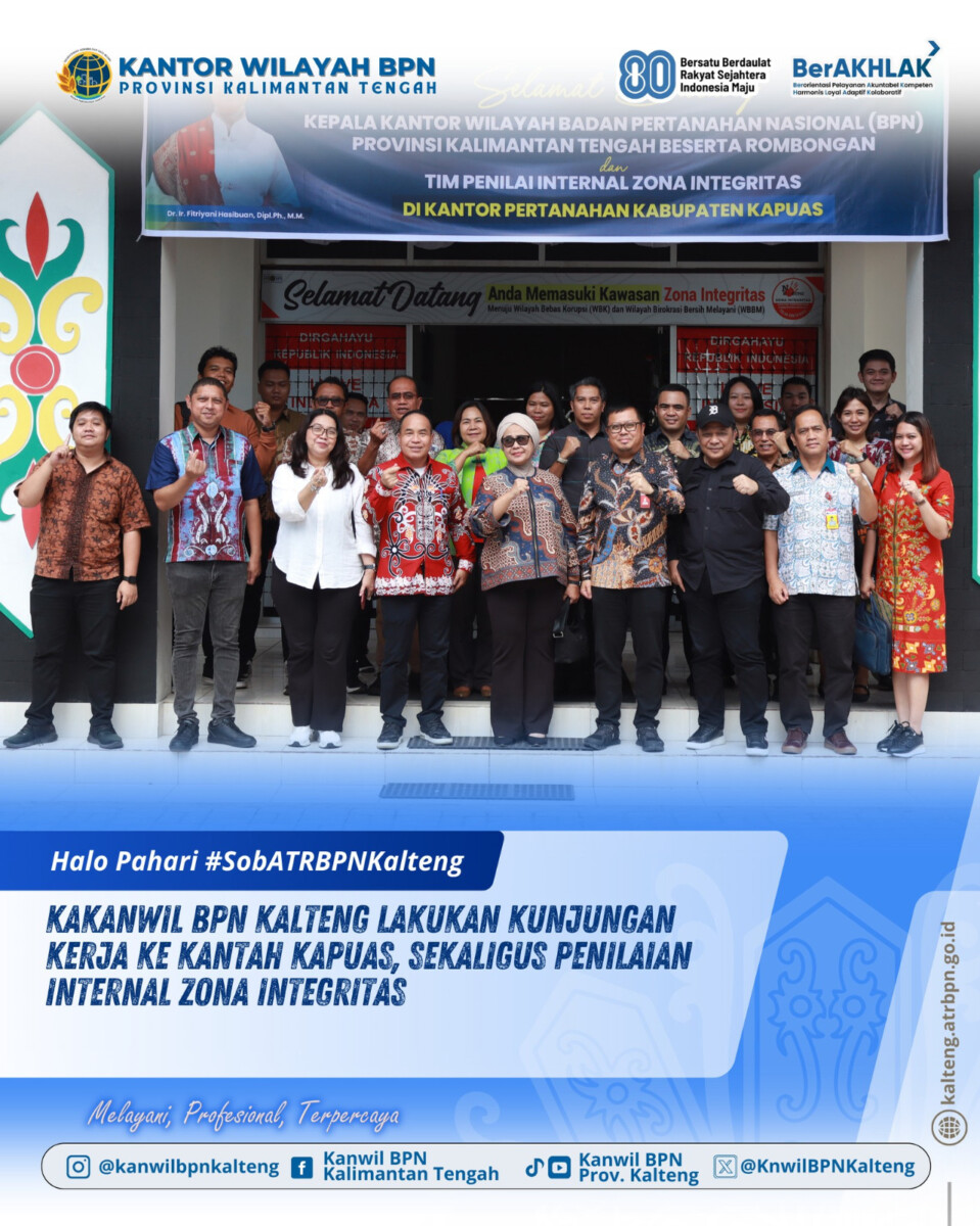 Kuala Kapuas, Nusaborneo.com – Kepala Kantor Wilayah Badan Pertanahan Nasional (BPN) Provinsi Kalimantan Tengah (Kalteng), Fitriyani Hasibuan, beserta jajaran melakukan kunjungan kerja (Kunker) ke Kantor Pertanahan Kabupaten Kapuas @kantahkabkapuas. Kunjungan ini selain bertujuan untuk mempererat koordinasi dan pembinaan kinerja, juga sekaligus melaksanakan tugas sebagai Tim Penilai Internal Zona Integritas (ZI).