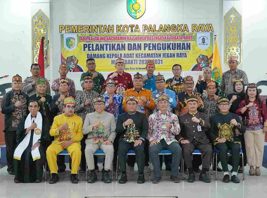 Palangka Raya, Nusaborneo.com – Plt. Sekretaris Daerah Provinsi Kalimantan Tengah sekaligus Plt. Ketua Umum Dewan Adat Dayak (DAD) Kota Palangka Raya, Leonard S. Ampung, menghadiri pelantikan dan pengukuhan Damang Kepala Adat Kecamatan Jekan Raya yang digelar di Aula Peteng Karuhei, Kantor Wali Kota Palangka Raya, Jumat (14/11/2025).