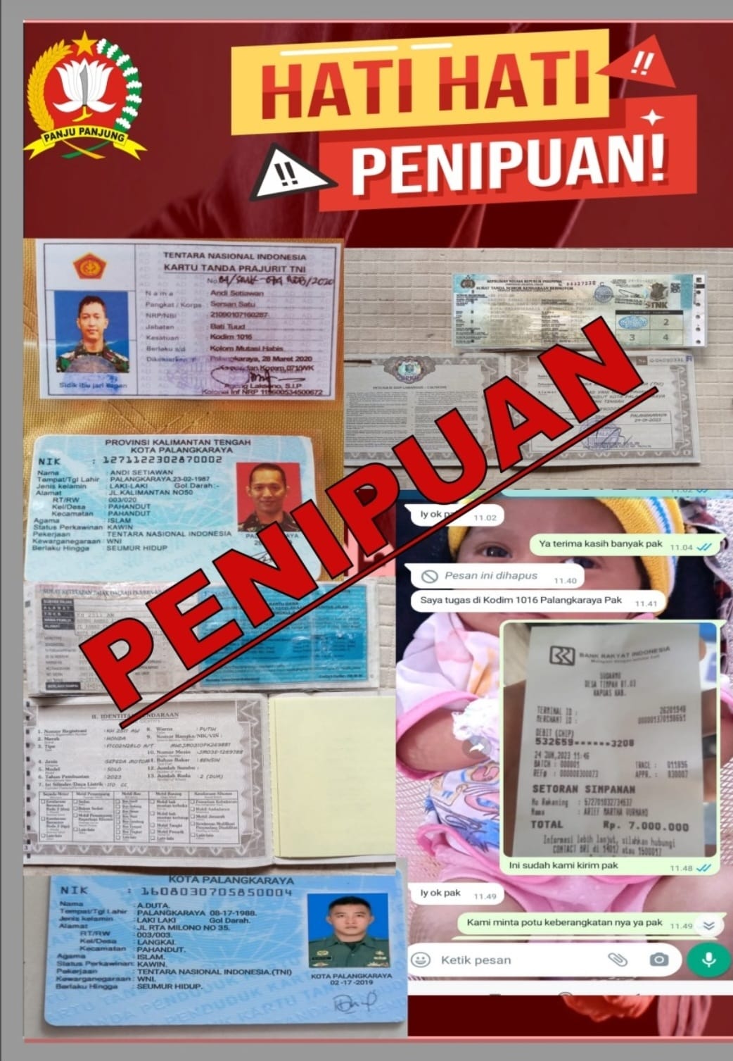 “Anggota Kodim 1016/Plk selama ini tidak ada yang terlibat dalam penjualan sepeda motor ataupun mobil dengan harga murah, jika ada pihak yang mengatasnamakan anggota Kodim 1016/Plk untuk melakukan penipuan, segera laporkan ke kantor Makodim atau pihak berwajib,” ucapnya.